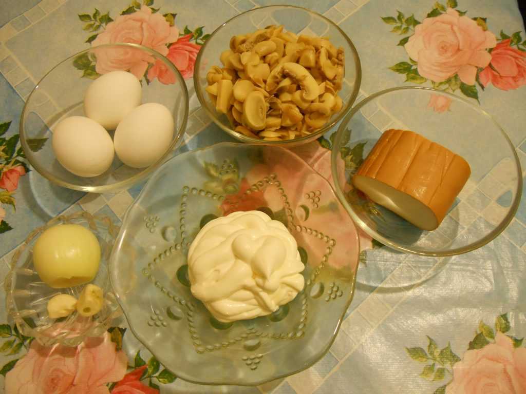 Из банки с грибами сольём жидкость. Почистим и вымоем лук и чеснок. Яйца отварим вкрутую. Сыр освободим от упаковки.