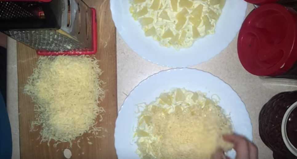 Поверх яиц делаем слой ананасов и засыпаем тертым сыром. Равномерно распределяем по поверхности.