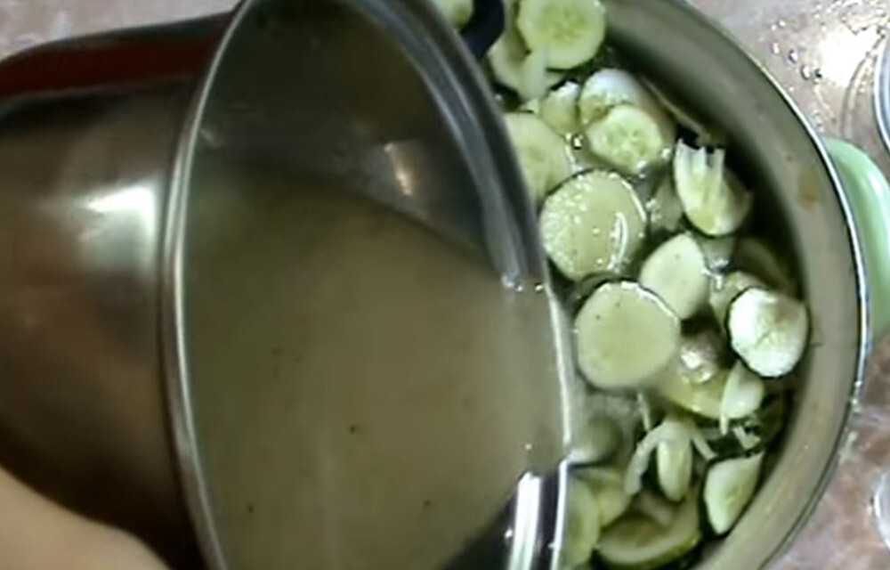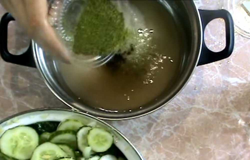 Огурцы перекладываем в эмалированный тазик или кастрюльку. Заливаем их нашей ароматной смесью.
