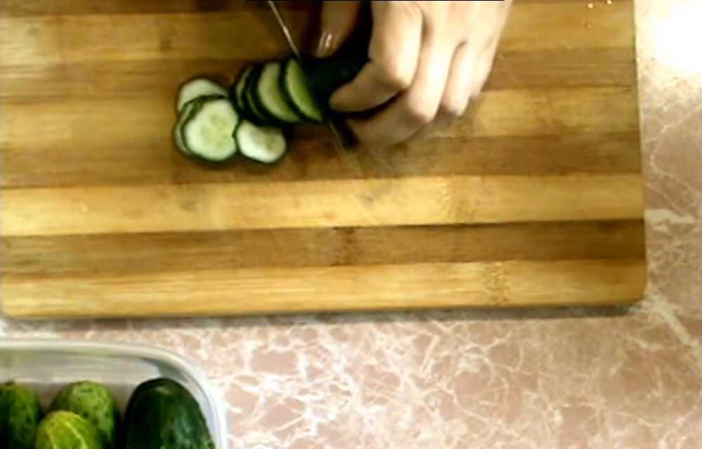 - Нарезаем огурцы на кружочки толщиной 3 мм. Более крупные огурцы можно нарезать полукружками.
