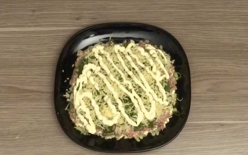Четвертый слой — зеленый лук: его удобно распределить рукой. Поверх этого слоя также можно промазать майонезом, но не стоит его размазывать и прижимать нарезку.