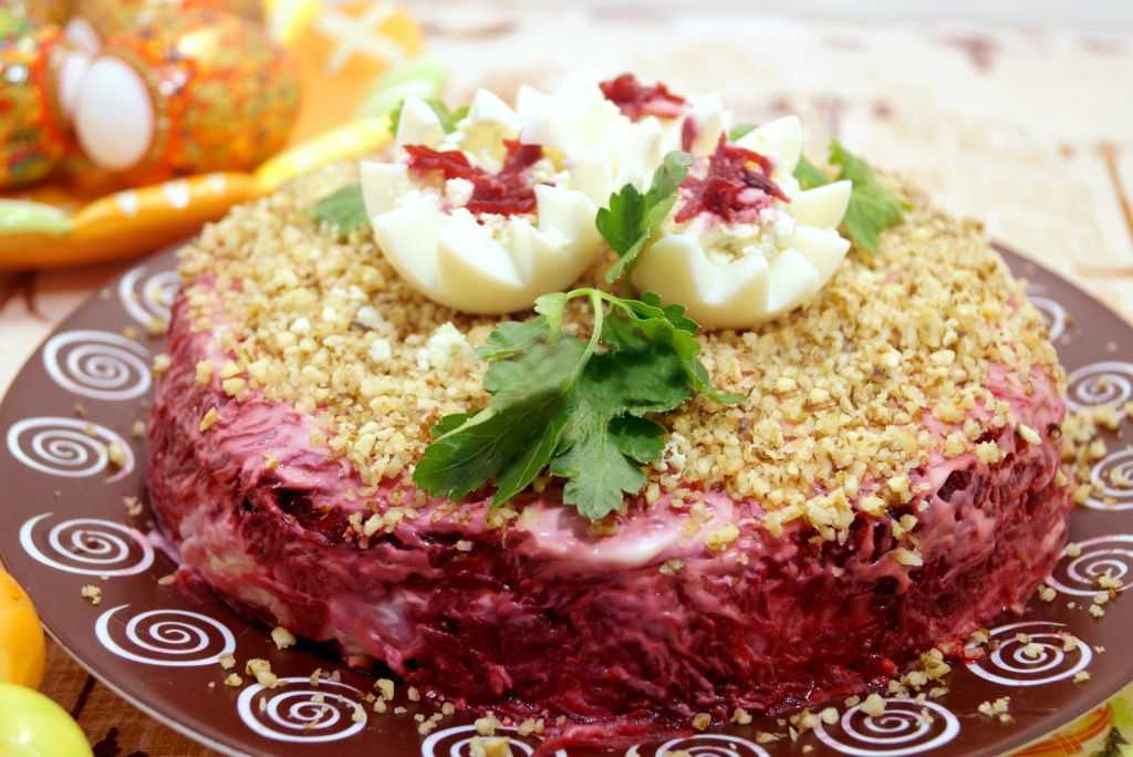 - Сверху украшают блюдо вареными яйцами и колотыми орешками.