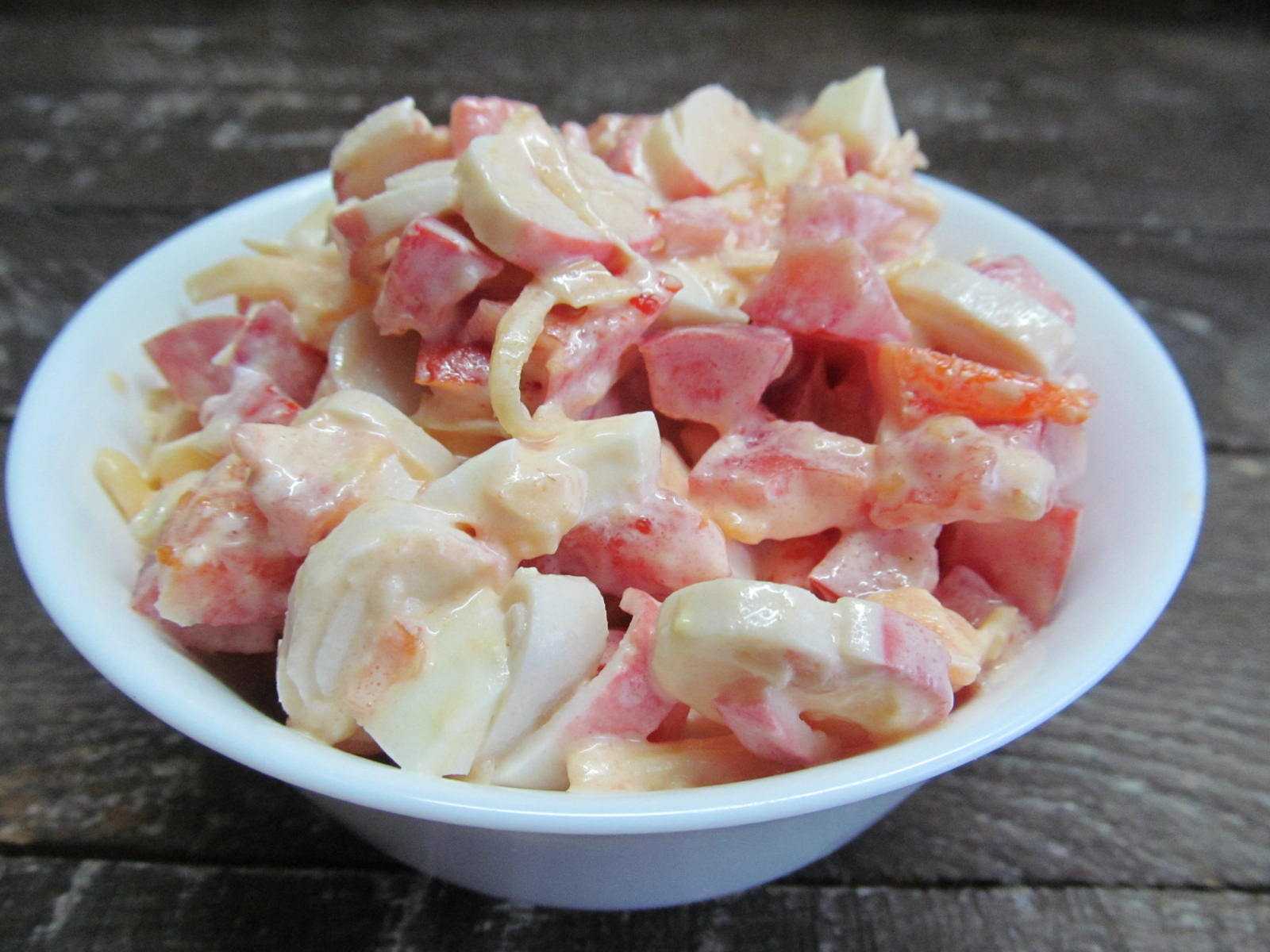Рецепт слоеного салата «Красное море» с крабовыми палочками