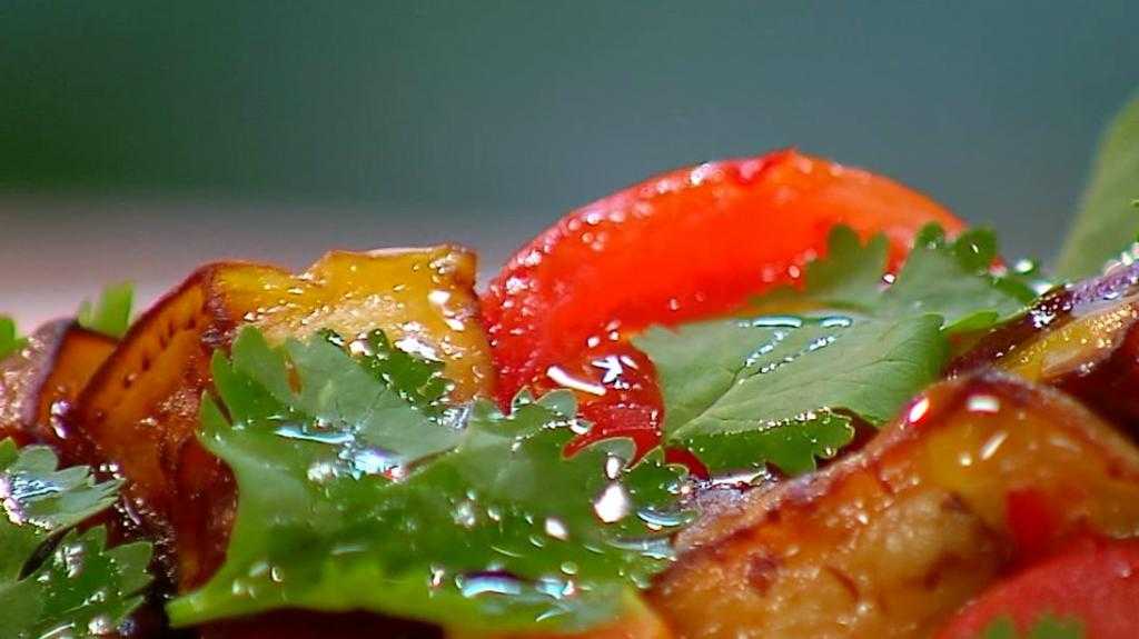 Как пожарить хрустящие баклажаны и приготовить с ними салат с помидорами (рецепт с видео)