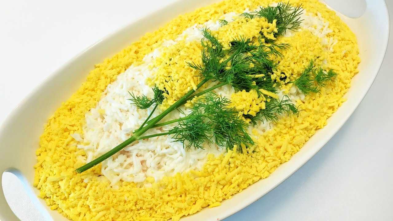 Простой рецепт салата Мимоза с рисом и сайрой без картошки