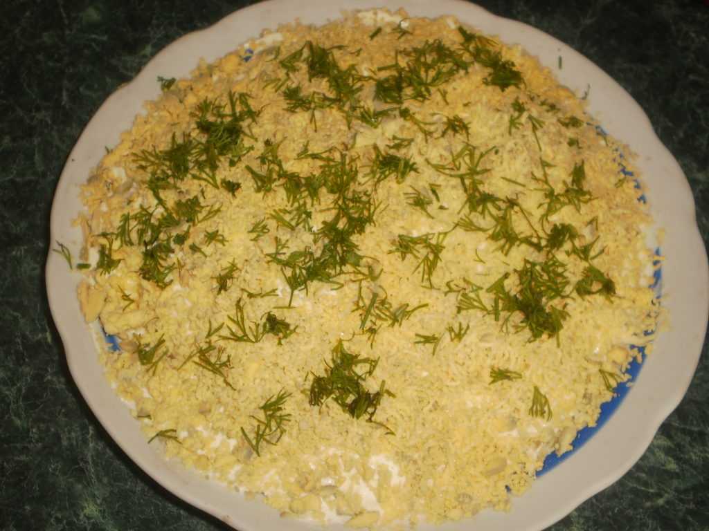 Сверху посыпаем раскрошенным желтком. Ставим салат на несколько часов в холодильник.
