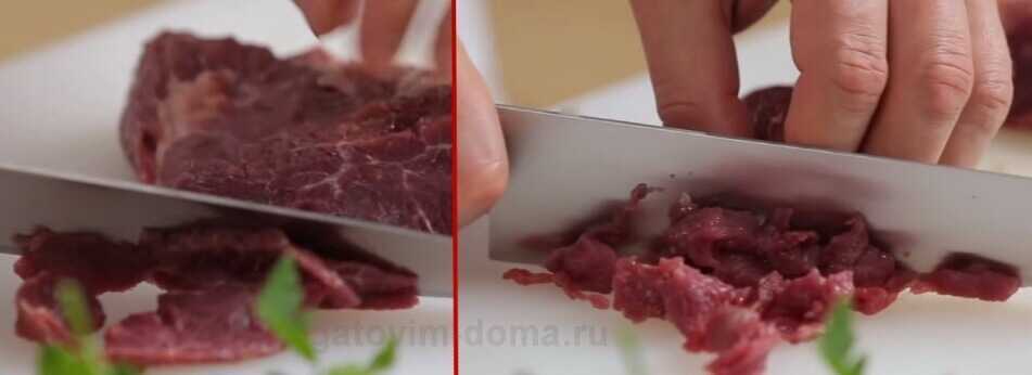 Остудив, нарезаю говядину ломтиками толщиной примерно 2 см. Тоньше не нужно, при перемешивании ломтики сами разделятся на крупные волокна.