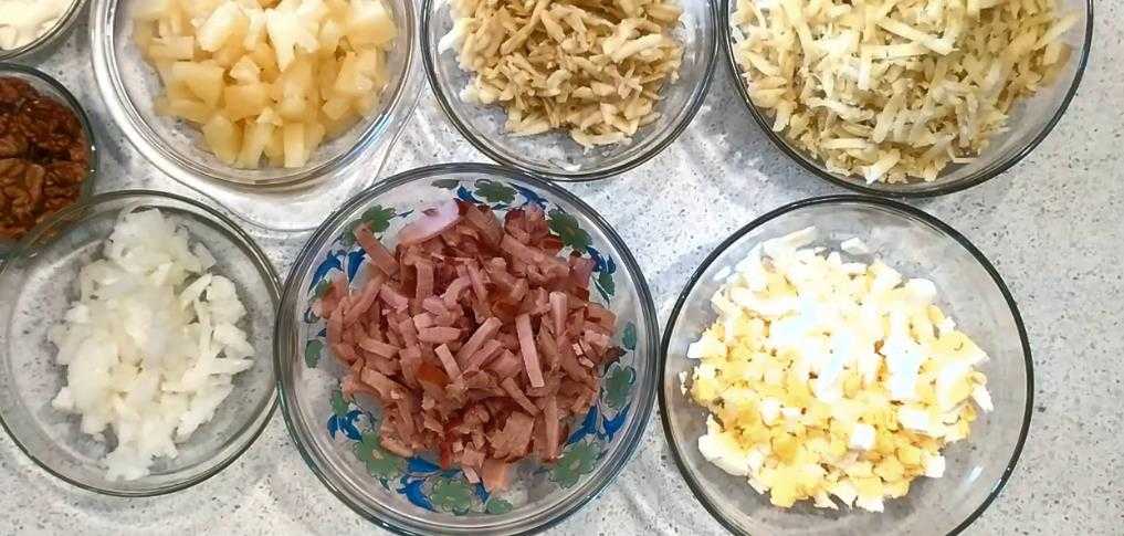Этот рецепт салата уважают любители экзотических сочетаний, поскольку в него добавляются сочные ломтики ананаса и хрустящие орехи. Чтобы приготовить закуску, нужно немного потрудиться, но ее оригинальный вкус запоминается надолго.