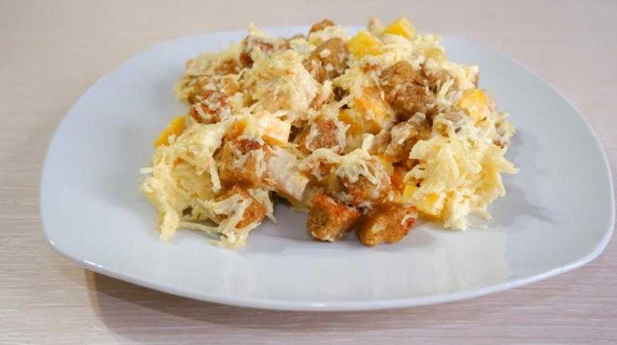 Благодаря тому, что практически все продукты берутся в готовом виде, приготовить сытную и ароматную закуску можно быстро. Идеальный вариант для детей, которые любят необычные сочетания компонентов, особенно хруст гренок.
