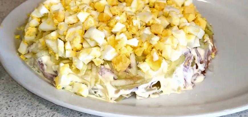Такой рецепт – вариант сытной закуски. Сочная, нежная, не стандартная. Даже если только она будет стоять на столе, насытится все семейство, съев даже по небольшой порции. А уж если впереди длинная новогодняя или рождественская ночь, лучшее угощение и придумать трудно: оно даже выглядит празднично. И пусть на подготовку компонентов уходит чуть больше времени, чем обычно – салат стоит того, чтобы с ним повозиться. Объедение!