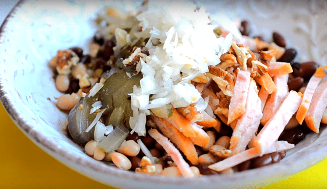 Рецепт очень простой и все что требуется — это нарезать и смешать ингредиенты. Но есть одна небольшая хитрость для фасоли.