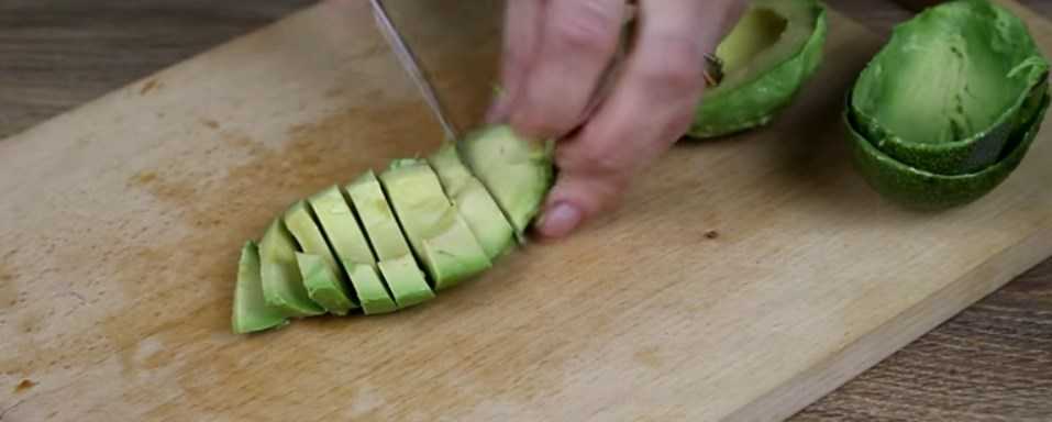 - Авокадо очистить от шкурки. Идеально будет, если его консистенция будет мягкой или приближаться к таковой. Но не стоит брать чрезмерно перезревший плод, так как он будет превращаться в кашицу при нарезке. После очищения необходимо вдоль по всему контуру надрезать мякоть. Сдвинуть две половинки в разных направлениях, проворачивая их – так получится раскрыть авокадо. Одна половинка останется без сердцевинки. А из второй нужно будет удалить крупную косточку. Для этого по ней слегка ударяют ножом и немного выворачивая, достают ее.