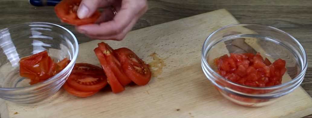 - Помидоры ошпарить кипятком, чтобы легче снималась шкурка. Удалить ее, а мякоть нарезать на кубики среднего размера.