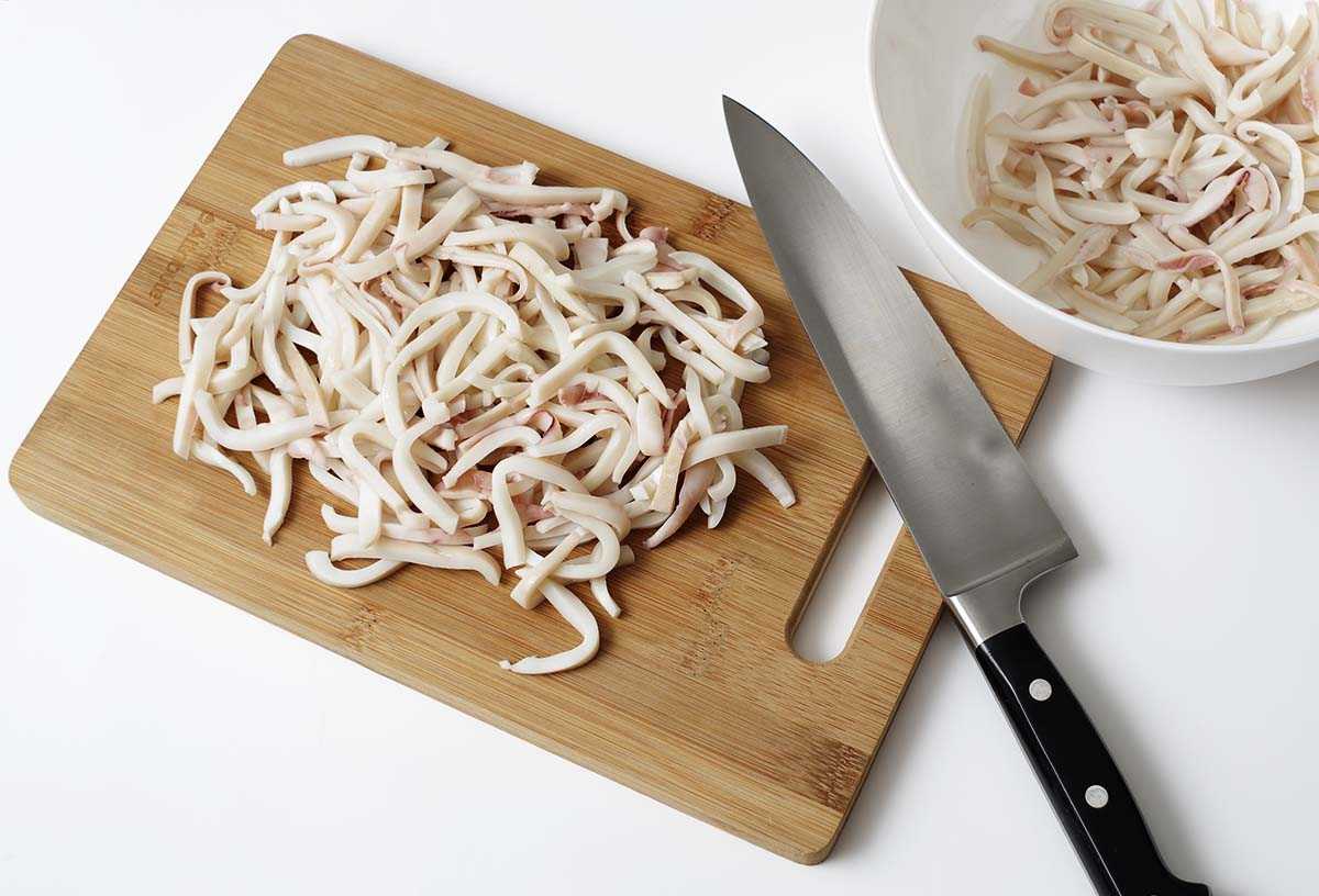 Кальмары нарезаем острым ножом на половинки, потом — удлиненными полосками.