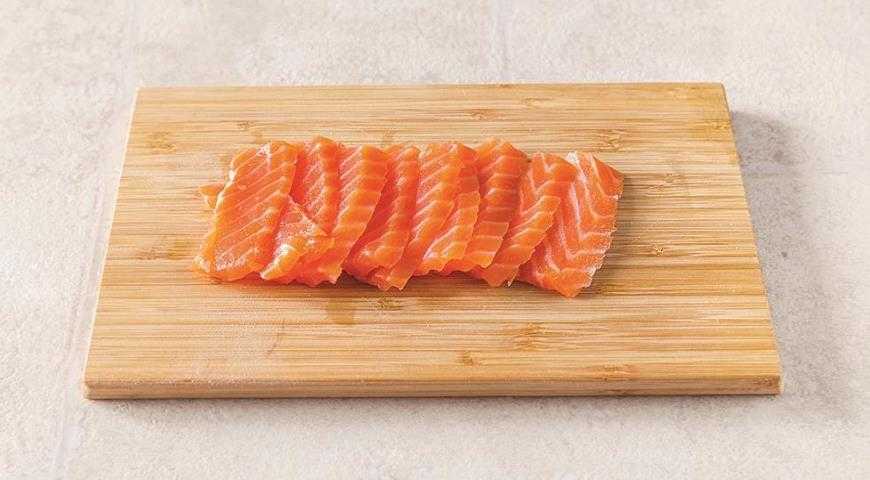 - Слабосоленая красная рыба (лучший выбор — семга, но вполне подойдет и горбуша, если ее правильно засолить) — 150 г;