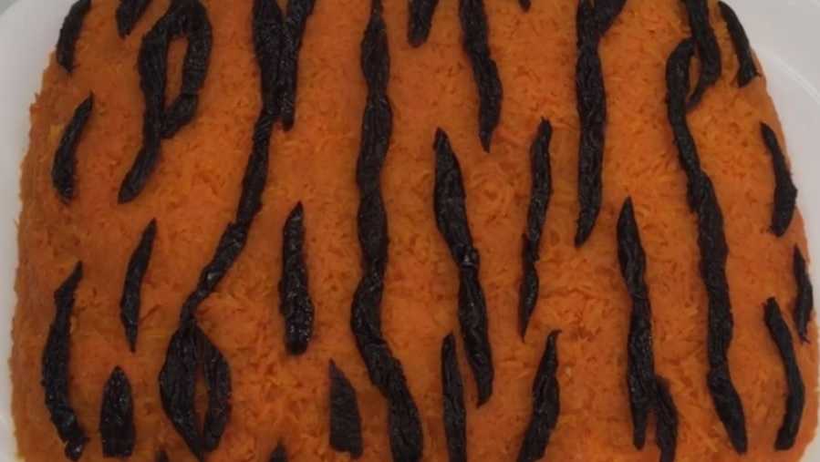 Оформить салат в виде тигриной шубы с полосками из чернослива.
