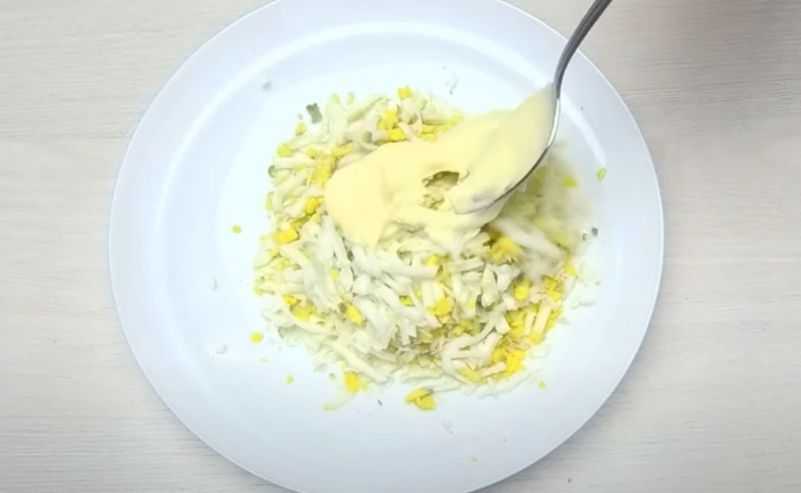 Далее кладутся порезанные кусочками. В отличие от предыдущих рецептов, этот слой тоже нужно смазать майонезом. Следом идет тертый сыр из твердых — и очередная промазка. А вот натертые яйца, насыпанные сверху, уже не покрываются майонезом. Хотя им можно для красоты нарисовать тонкую сеточку. Для украшения используются колечки маслин и веточки зелени.