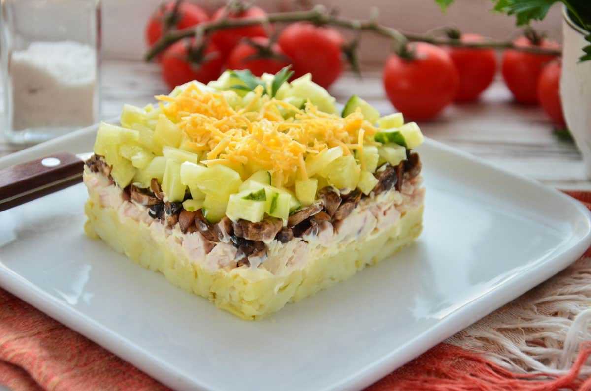 В различных вариациях приготовления описываемого закусочного салата встречаются как маринованные, так и жареные грибочки. Получится настоящий кулинарный шедевр с необычайным вкусом.