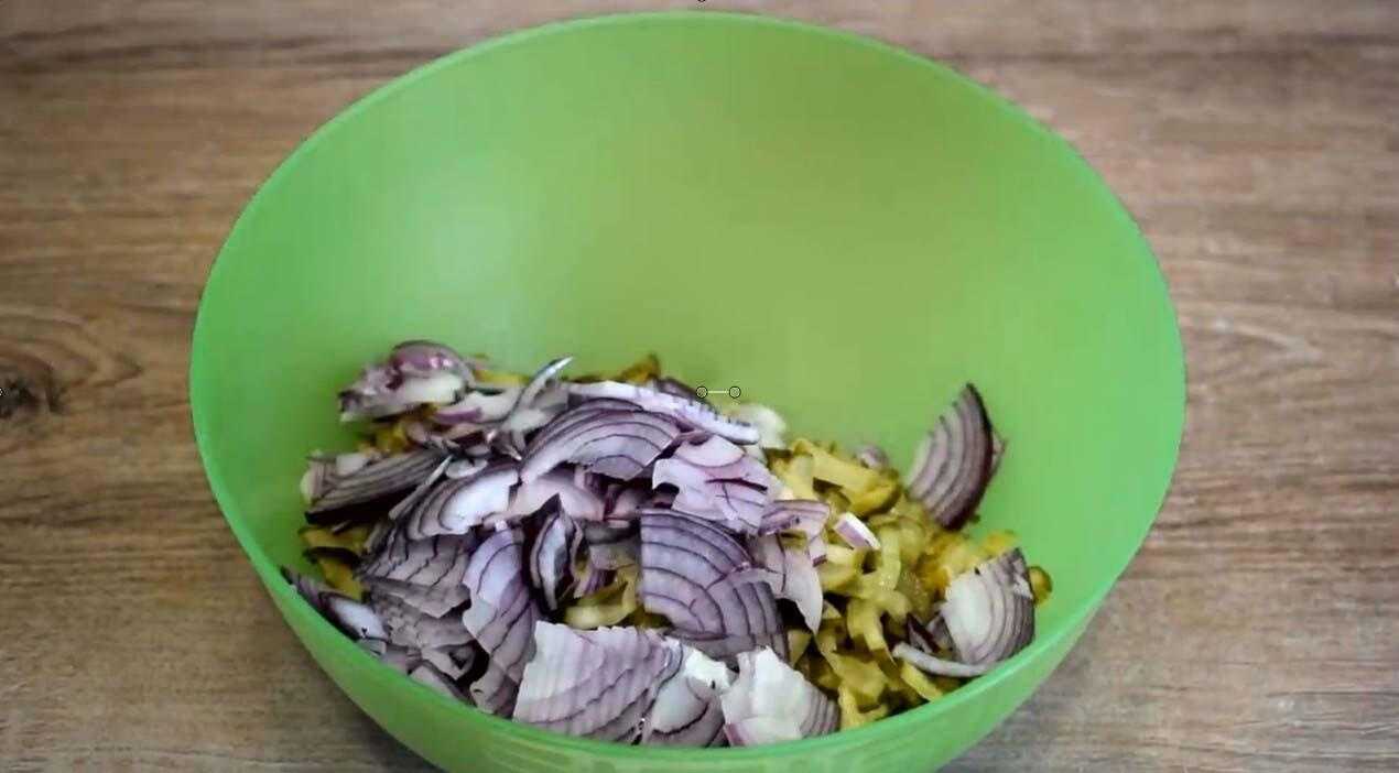 2. Нарежьте лук кольцами или полукольцами, добавьте соль и слегка пожмите руками.