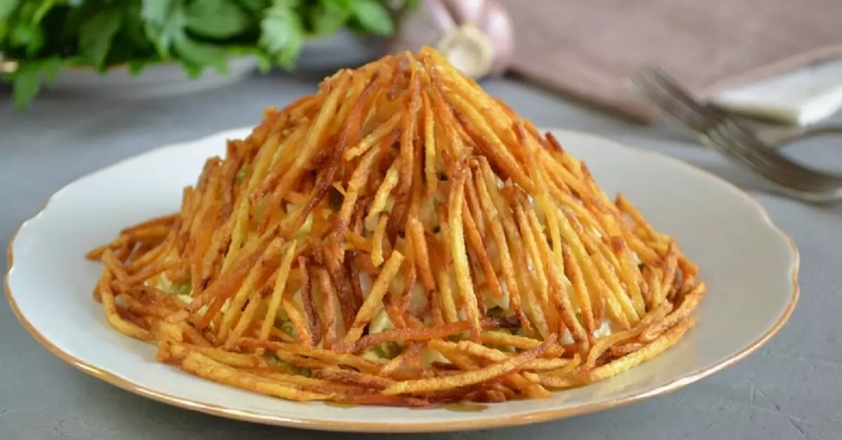 Чтобы приготовить салат с картошкой пай, нужно изначально правильно пожарить овощ. Нужно взять продукты в пропорции: