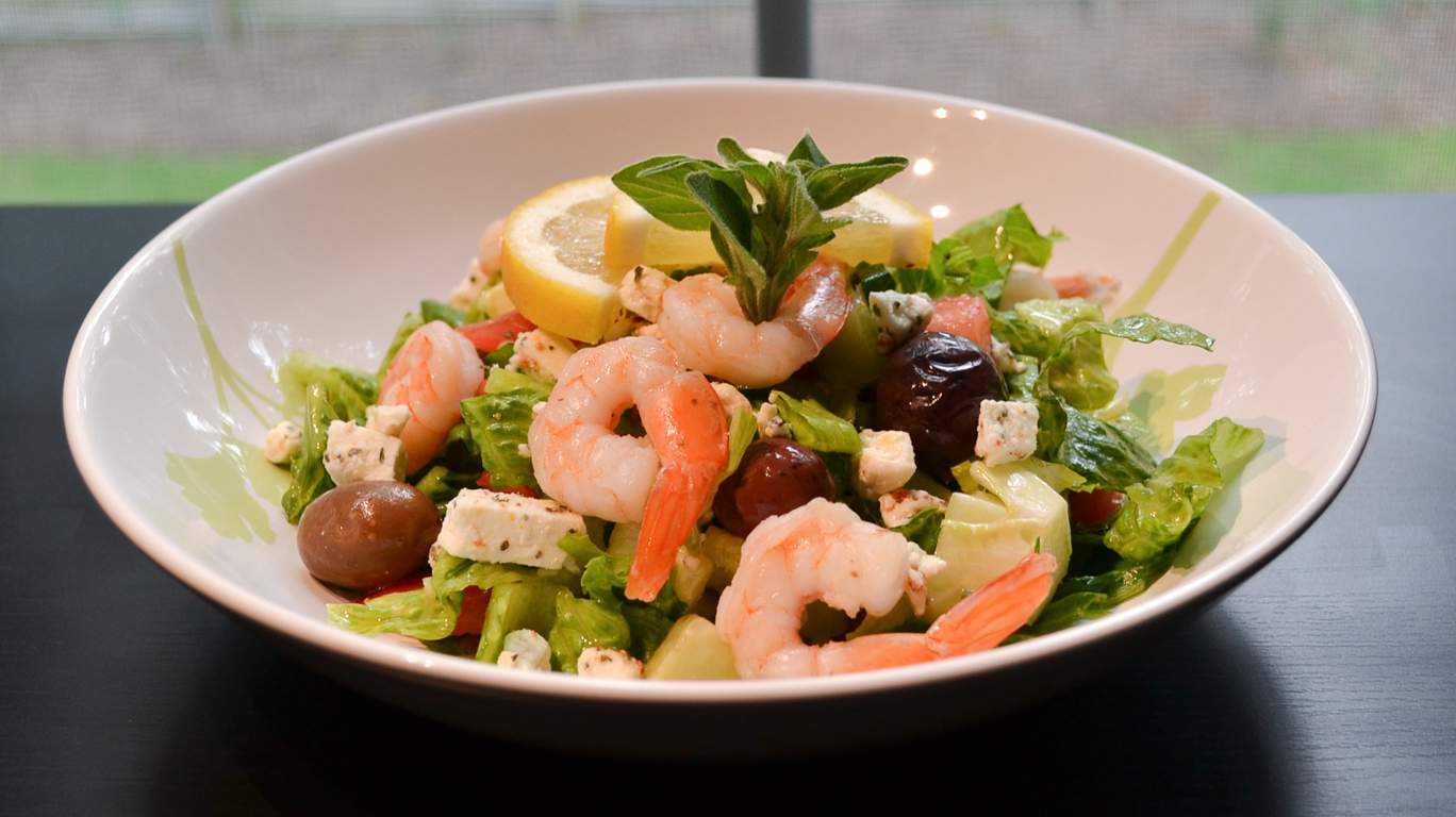 - В глубокий салатник всыпьте измельченные листья салата, подготовленные овощи с креветками и маслины, порезанные тонкими колечками. Заправьте греческий салат соусом из оливкового масла, свежевыжатого лимонного сока и специй, тщательно перемешайте, чтобы он равномерно распределился по овощам и морепродуктам.