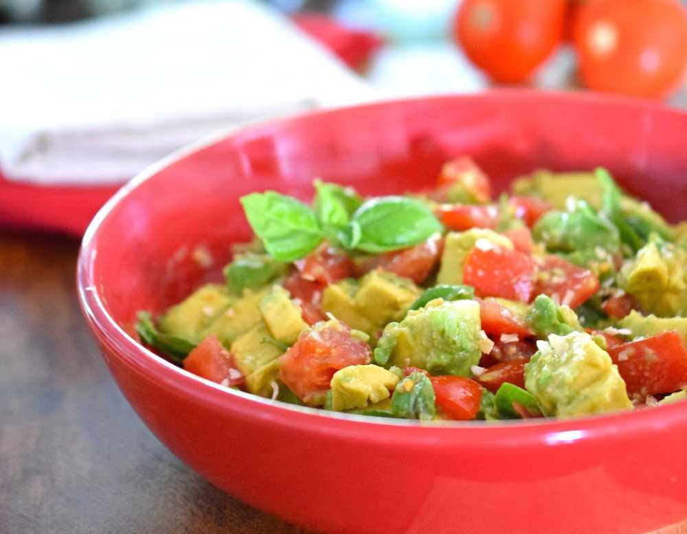 Сперва нужно заняться авокадо. Его очищают от кожуры, делят пополам, освобождают от косточки, режут кубиками и высыпают в объемную миску. Туда же добавляют рубленую петрушку, рваные салатные листья, половинки черри и кусочки сыра. Напоследок все это подсаливают и перемешивают с соусом, сделанным из уксуса, сахара, толченого чеснока и постного масла.